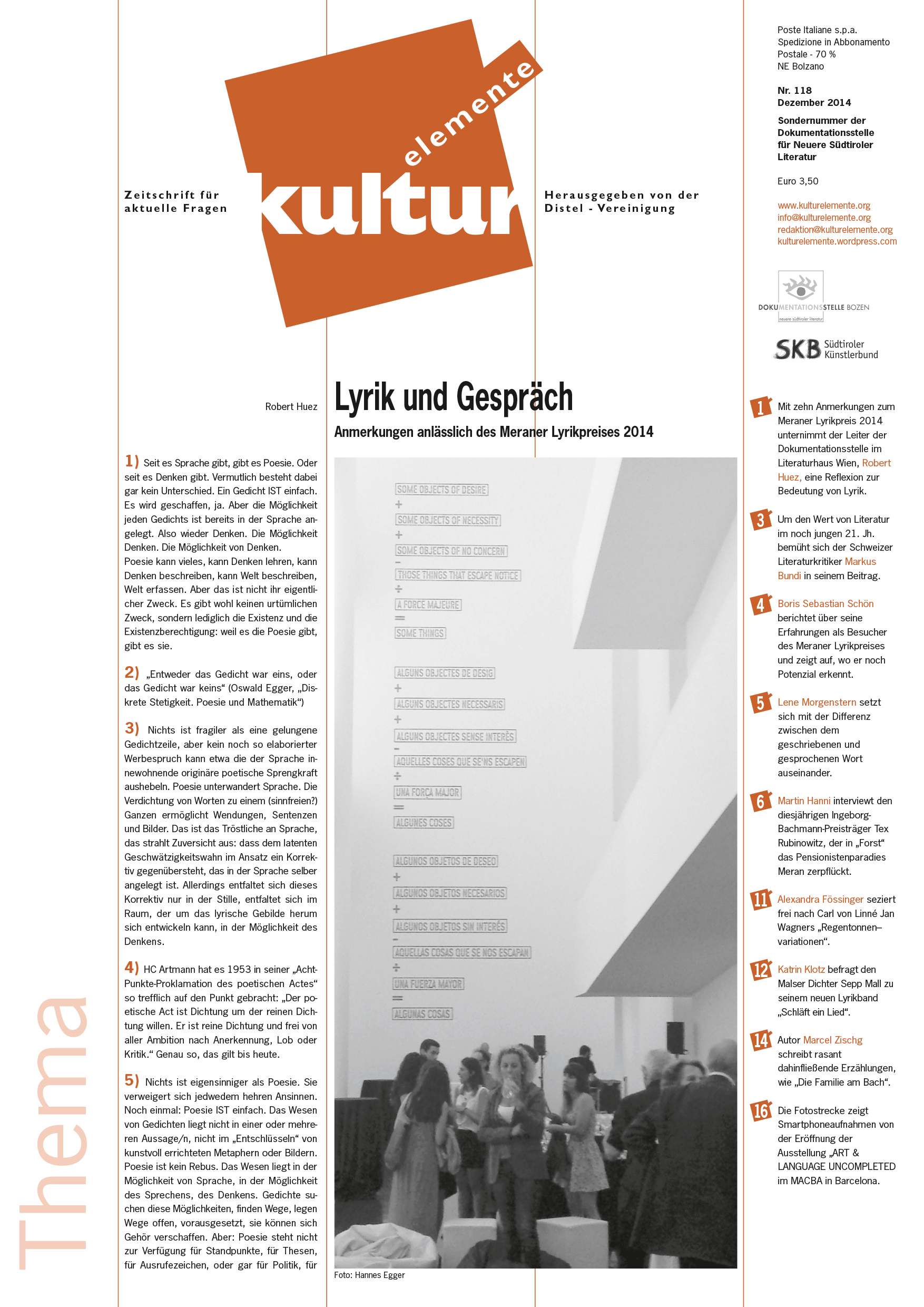 Die zeitgemäße und un-zeitgemäße Rolle der Lyrik steht – in Zusammenarbeit mit der Dokumentationsstelle für neue Südtiroler Literatur des SKB – im Fokus der Dezemberausgabe der Kulturelemente. Den Anfang macht Robert Huez, der Leiter des Literaturhauses Wien, mit zehn Anmerkungen anlässlich des Meraner Lyrikpreises 2014. Boris Sebastian Schön berichtet von seinen Erfahrungen als Besucher des Meraner Lyrikpreises und erklärt, warum er ihn für einen der spannendsten literarischen Events hält, aber trotzdem noch ungenütztes Potential erkennt.